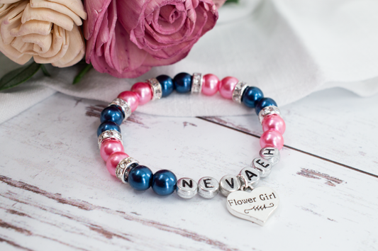 Name Flower Girl Rhinestone Bracelet | Coral + Navy